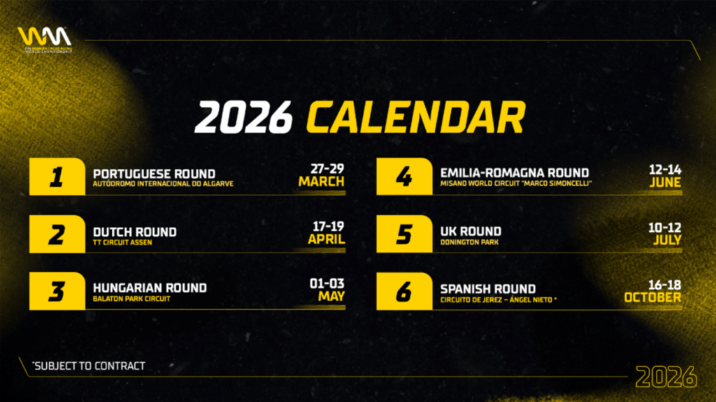 La Federación Internacional de Motociclismo ha anunciado el calendario provisional del WorldWCR. Al igual que en las dos anteriores ediciones, el campeonato estará compuesto por doce carreras repartidas en seis citas por toda Europa. El comunicado destaca el regreso de los circuitos de Misano y Portimao, los cuales ya estuvieron en la temporada 2024.